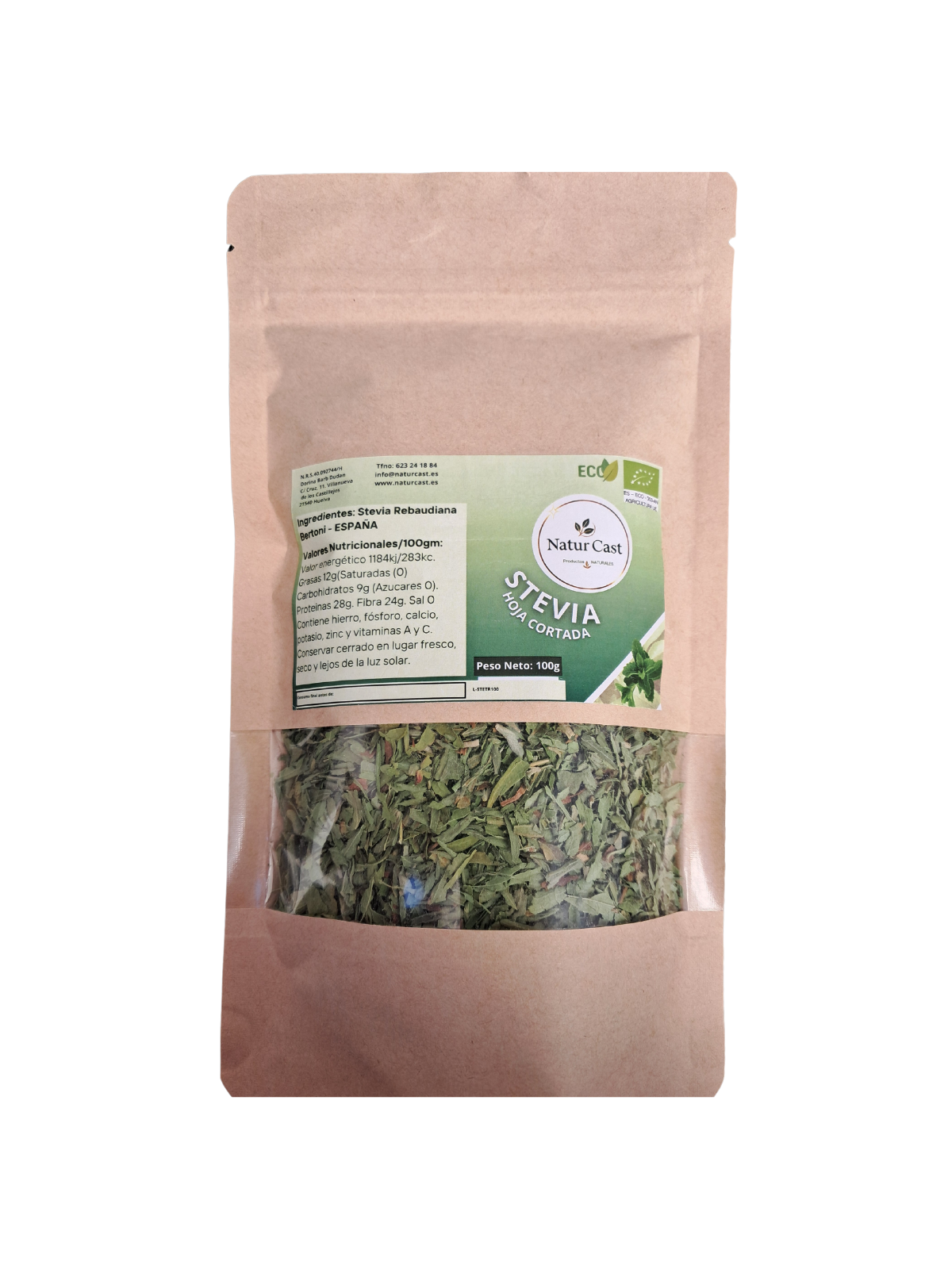 Las hojas secas cortadas de stevia de Naturcast son una alternativa natural al azúcar,