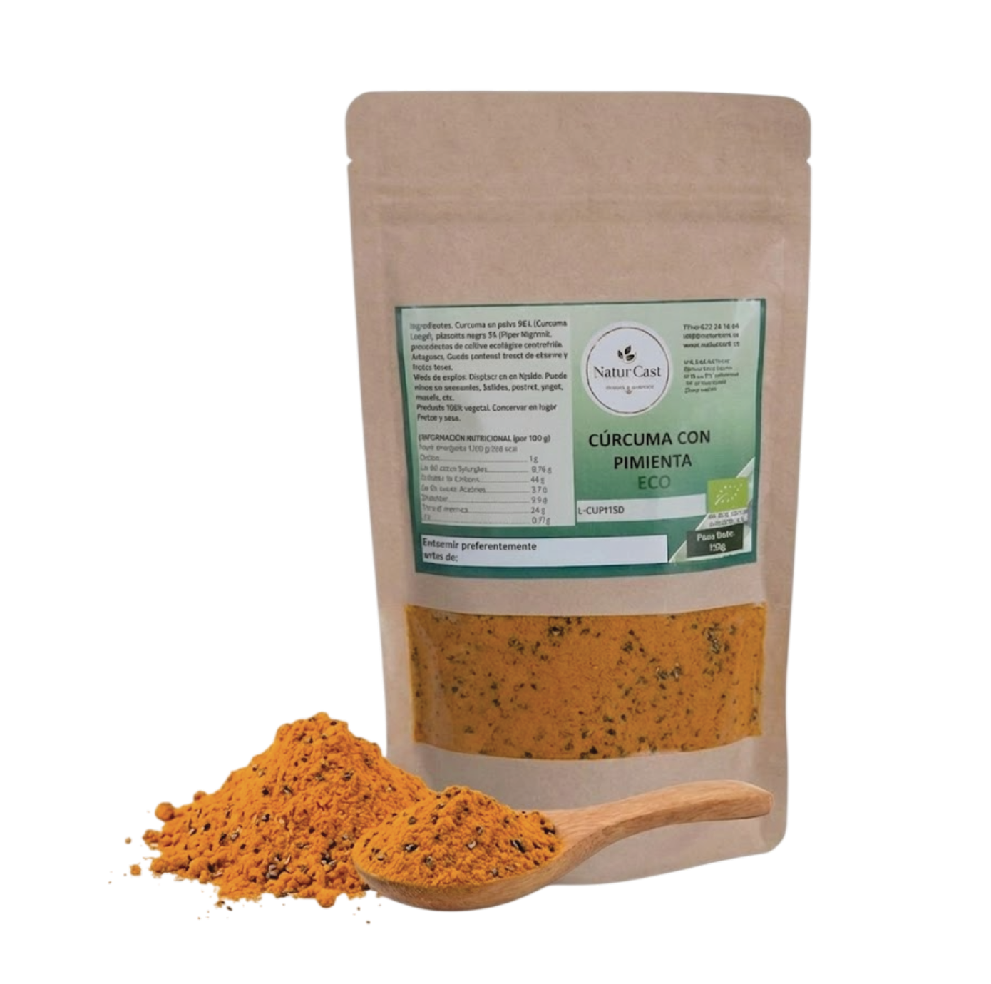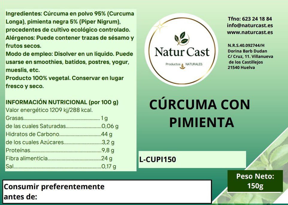 Ingredientes: polvo de cúrcuma orgánica con pimienta.