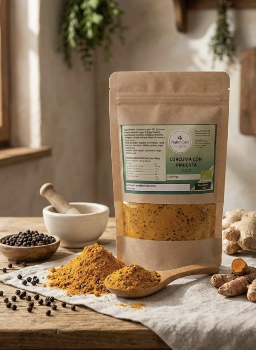 La cúrcuma con pimienta es una combinación natural muy utilizada por sus reconocidas propiedades beneficiosas. La pimienta potencia la absorción de la curcumina, el principal compuesto activo de la cúrcuma, aumentando su eficacia de forma natural.
