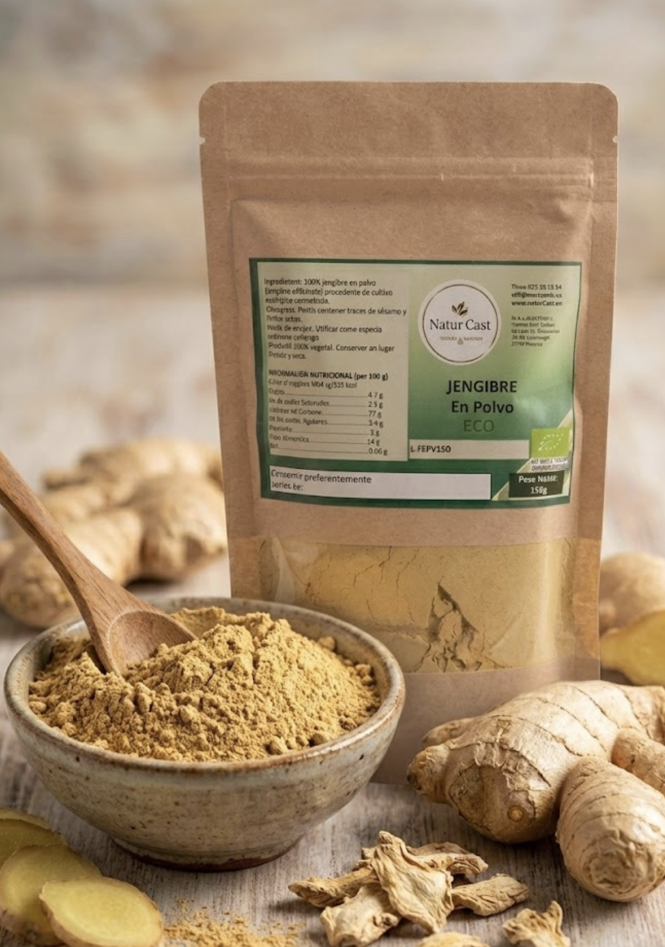 Jengibre en polvo ecológico de alta calidad, elaborado a partir de raíz seca. Destaca por su sabor cálido y ligeramente picante, ideal para cocina, infusiones y recetas saludables.