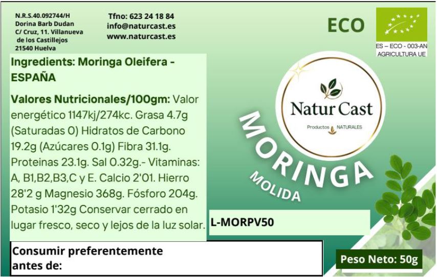 La moringa oleifera en polvo es un superalimento de origen español, cultivado de forma ecológica y elaborado exclusivamente a partir de hojas secas molidas, sin aditivos ni conservantes. Destaca por su alto valor nutricional, siendo rica en vitaminas, minerales, proteínas vegetales y antioxidantes, lo que la convierte en un complemento ideal para una alimentación equilibrada y consciente.