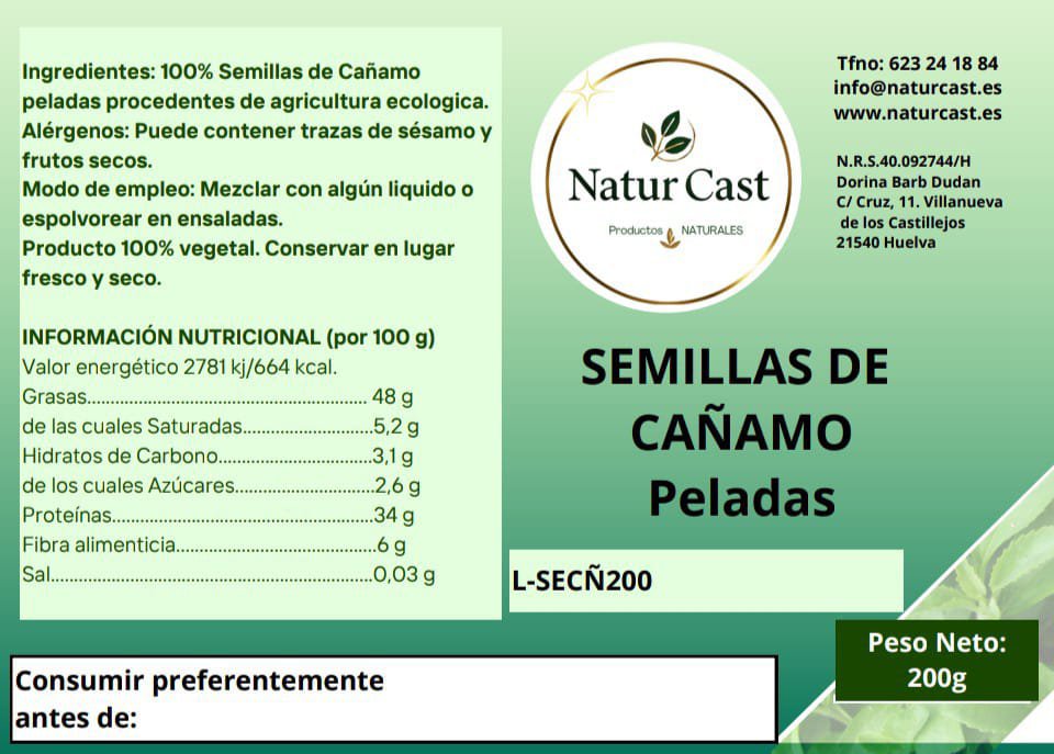 Ingredientes: semillas de cáñamo peladas ecológicas (Cannabis sativa L.). Producto 100 % natural, sin aditivos.