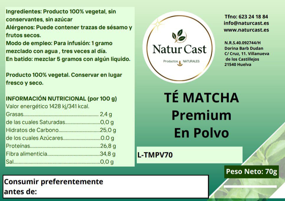 Ingredientes: té matcha en polvo 100 % vegetal.